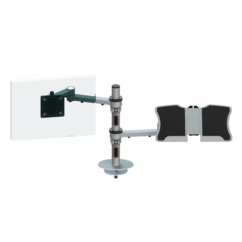 X-Stream dual beam, post mounted monitor arms with manual height adjustment, laptop attachment and baby c clamp.